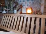Eiken kaarthouder met houtenwenskaart met droogboeketje en theelichtje